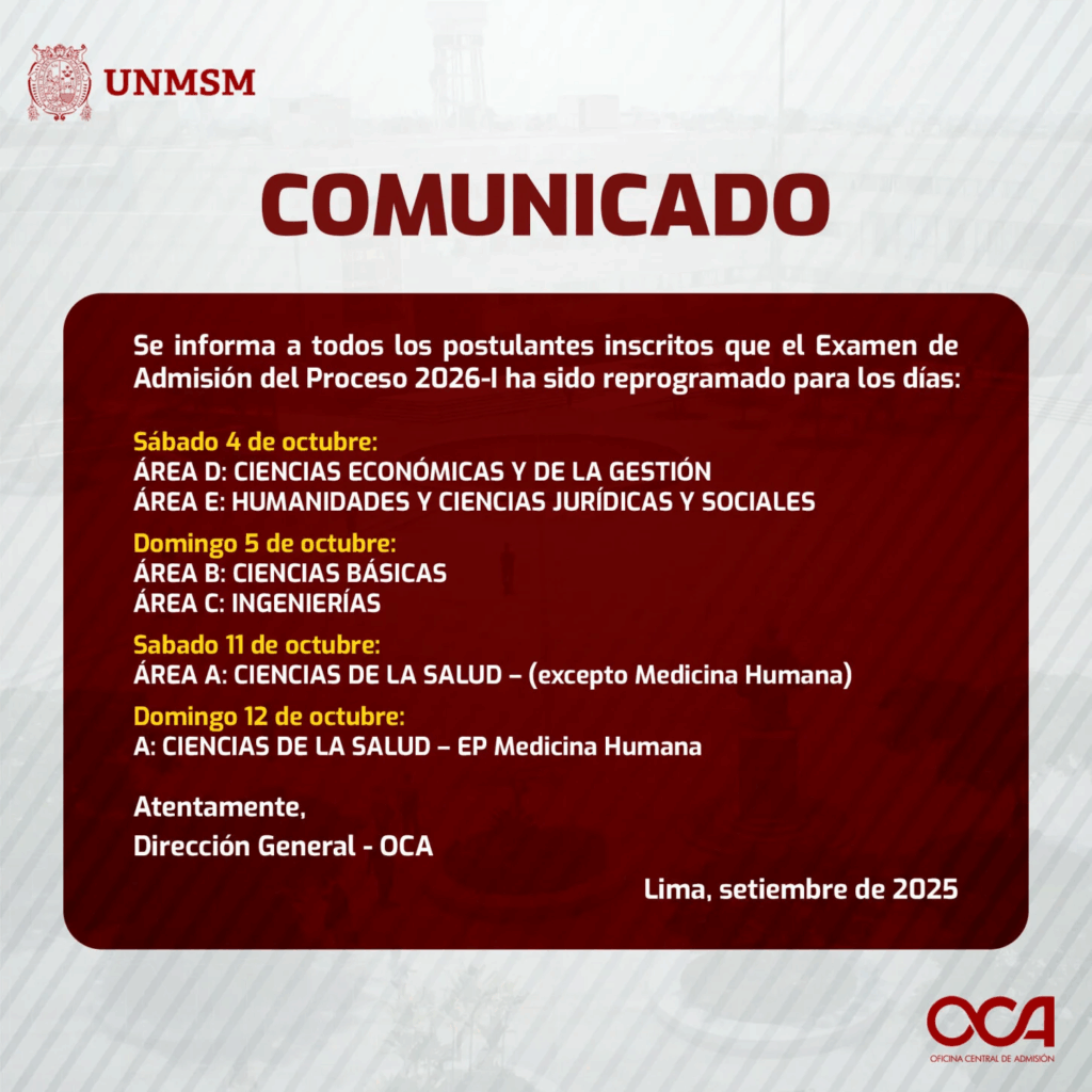 Con esta reprogramación, la universidad reafirma su compromiso de llevar adelante un proceso de admisión transparente, seguro y ordenado, ofreciendo a miles de jóvenes la oportunidad de acceder a una vacante en la universidad más antigua y prestigiosa del país.