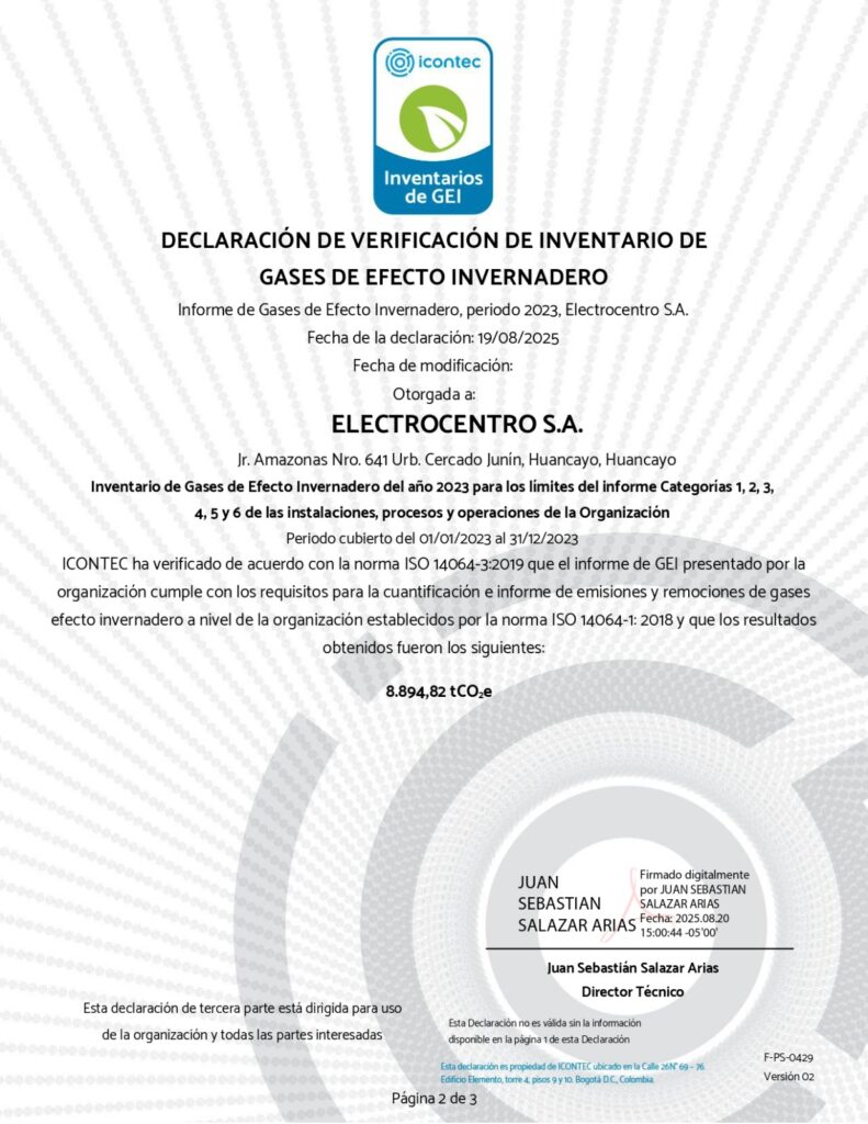 En el marco de su compromiso con la sostenibilidad y la gestión ambiental responsable, Electrocentro obtuvo la certificación de Icontec por la verificación de su inventario de Gases de Efecto Invernadero (GEI) correspondiente al 2023. El informe, elaborado bajo los lineamientos de la norma ISO 14064-1:2018, determinó un resultado de 8.894,82 toneladas de CO₂ equivalente (Tco₂e), considerando sus operaciones en Ayacucho, Huancavelica, Huancayo, Huánuco, Pasco, Selva Central, Tarma, Tingo María y Valle del Mantaro.