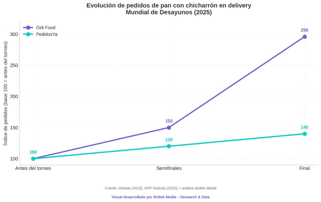 Este gráfico, elaborado por Boltek Media, muestra cómo en la semana de mayor viralidad los pedidos crecieron de manera notable en apps como Didi Food y PedidosYa, evidenciando que el fenómeno no solo benefició a grandes restaurantes, sino también a pequeñas chicharronerías y negocios de barrio.