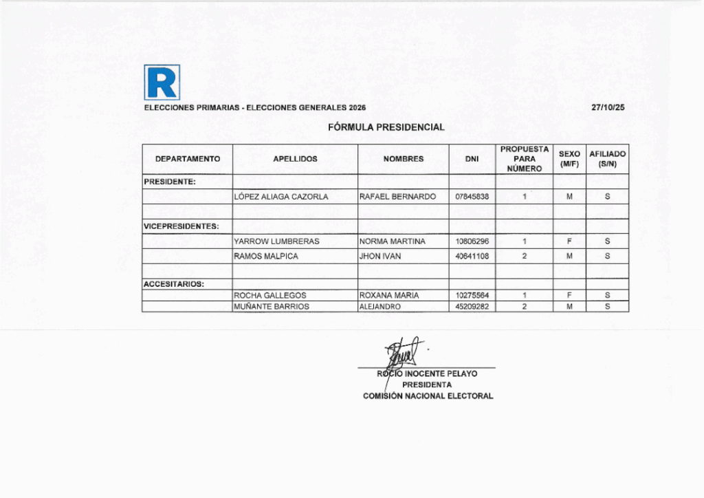Rafael López Aliaga formalizó su candidatura presidencial para las elecciones generales de 2026, encabezando la fórmula de Renovación Popular inscrita ante la Comisión Nacional Electoral el pasado 27 de octubre. Lo acompañan Norma Yarrow como primera vicepresidenta y Jhon Iván Ramos Malpica como segundo vicepresidente, además de Roxana María Rocha Gallegos y Alejandro Muñante Barrios como accesitarios.